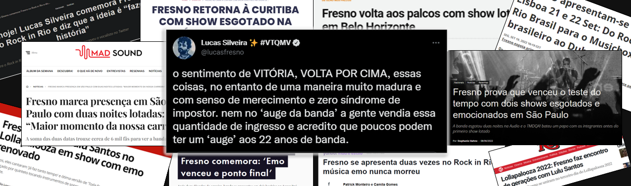 Recortes de jornais e tuites sobre o momento da banda Fresno