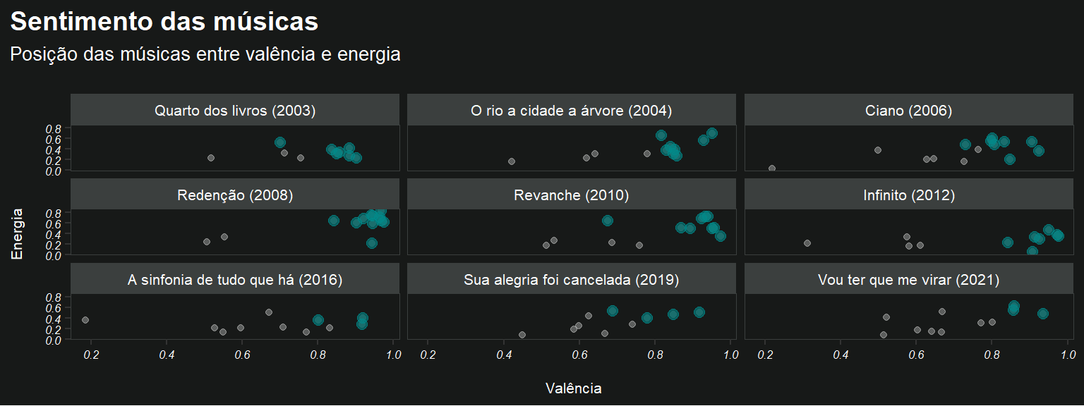 Ao passo que é possível perceber que a Fresno manteve um certo padrão no tamanho de seus discos, é interessante observar como isso foi diferente na composição. Observando a polaridade, podemos notar que a banda teve sua fase de músicas mais “positivas/felizes” (2008 a 2012), mas que, atualmente, tem preferido uma positividade musical mais baixa - diminuindo a energia com a manutenção da valência.