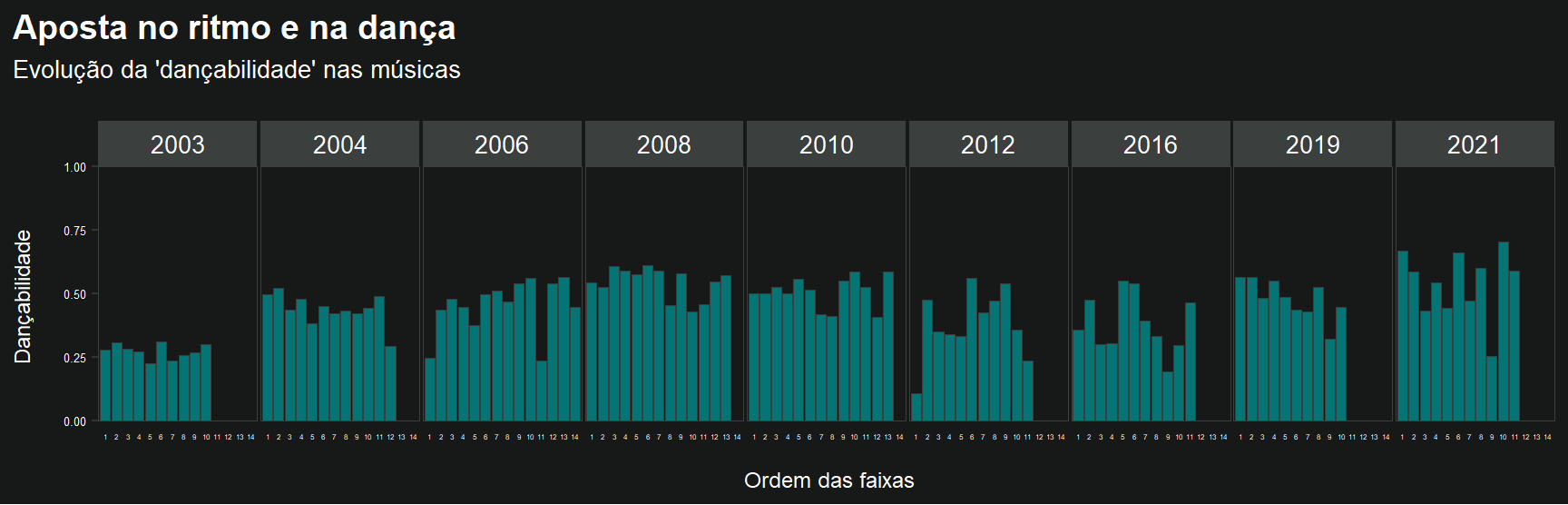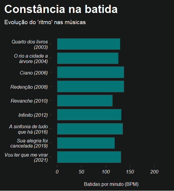 Observar como a banda também optou por manter a média de batidas por minuto (BPM) nos discos denota uma certa manutenção fiel ao estilo que seguiu e criou. A retomada da média no último disco, após uma leve redução em “Sua Alegria Foi Cancelada (2019)”, aliado ao aumento da dançabilidade, permite entender como a aposta, de fato, está em músicas com força e ritmo.