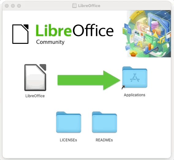 .dmgde instalação, através deste link, escolhendo o sistema operacional “MacOS” e clicando em “Baixar”.Após baixar o arquivo, abra-o. Uma janela irá abrir (como na imagem a seguir). Você deve arrastar o ícone “LibreOffice” para a pasta “Applications” (como mostrado na animação abaixo, sendo necessário arrastar apenas uma vez).
