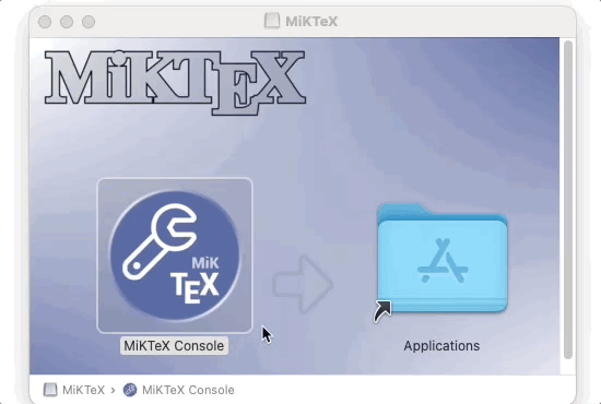 .dmgatravés deste link, escolhendo a versão de instalação para MacOS.Abra o arquivo baixado. Uma janela irá abrir, e você deve arrastar o ícone “MiKTeX Console” para a pasta “Applications” (como mostrado na animação abaixo, sendo necessário arrastar apenas uma vez).