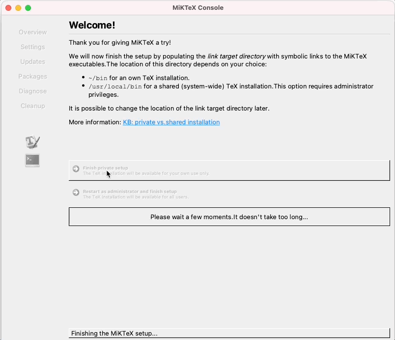 Ao abrir pela primeira vez, o MiKTeX solicitará que você selecione uma opção para que a instalação seja completada. Selecione “Finish private setup”, e isso fará com que o MiKTeX esteja disponível apenas no seu usuário do computador. Após selecionar essa opcão, ele terminará a configuração, e aparecerá uma mensagem dizendo que o MiKTex será reiniciado. Espere até que ele reinicie. Ao final, aparecerá uma mensagem dizendo que é necessário fazer atualizações no MiKTeX.