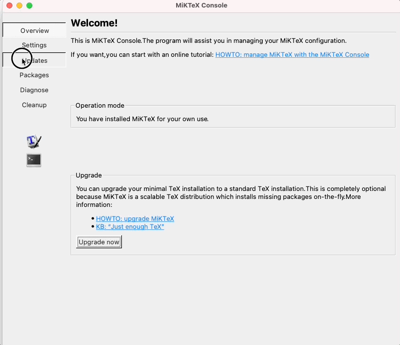 - No menu lateral, escolha a opção “Updates”. Clique em “Check for updates”, e o MiKTex buscará informações sobre as possíveis atualizações necessárias. Então clique em “Update now”, para que as atualizações sejam baixadas e instaladas.