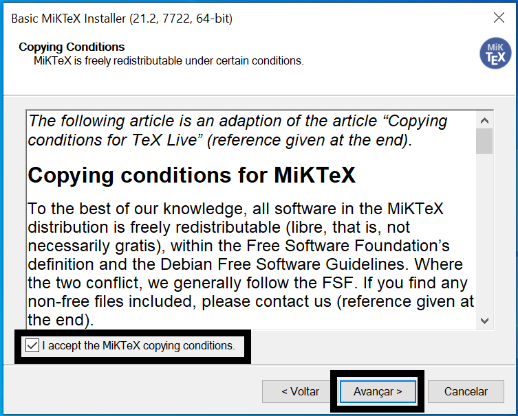 .exeatravés deste link, escolhendo a versão de instalação para Windows.Abra o arquivo baixado. Uma janela irá abrir, e a primeira etapa de instalação é a “Copying Conditions”. Nesta etapa você deve selecionar a opção “I accept the MiKTeX copying conditions” e clicar em “Avançar”.
