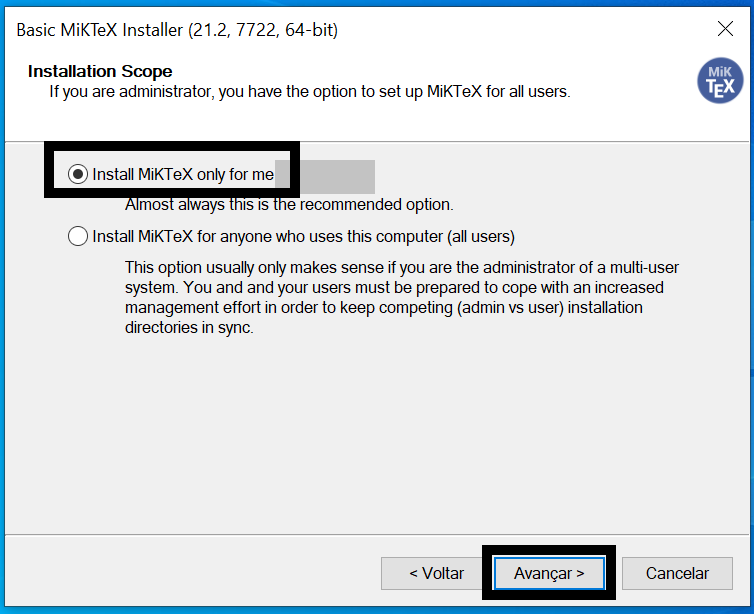 - A próxima etapa da instalação, chamada de “Installation Scope”, você deve escolher em qual usuário o software deve ser instalado. Selecione a primeira opção (“Install MiKTeX only for me.”) para que o MiKTeX seja instalado apenas no seu usuário atual no computador. Essa é a opção recomendada. Então clique em ”Avançar”.
