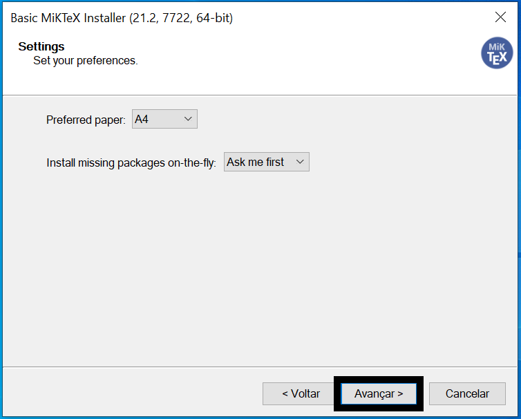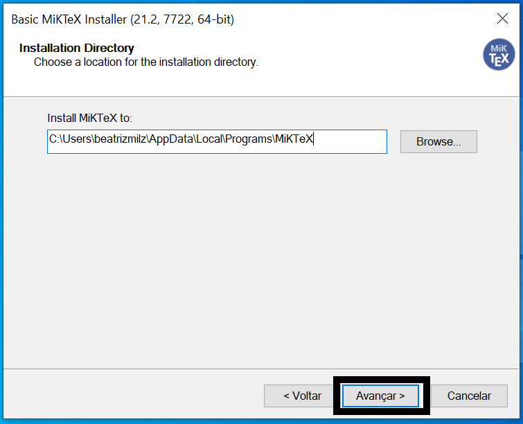 - Na etapa “Installation Directory”, escolha o diretório em que o MiKTeX será instalado. Caso tenha dúvidas sobre isso, não altere nada e utilize o caminho padrão de instalação. Então clique em “Avançar”.