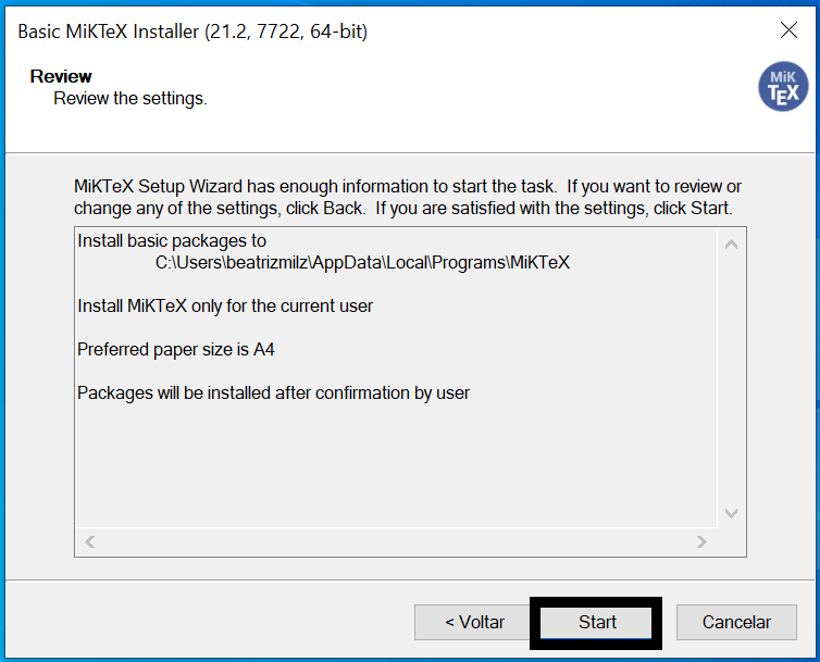 - Na etapa “Review”, são apresentadas as configurações escolhidas anteriormente. Clique em Start para que a instalação seja começada.