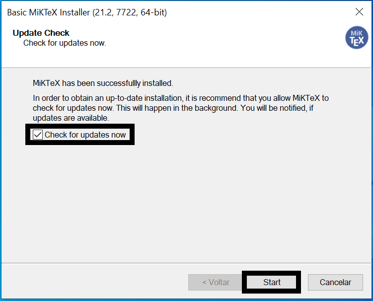 - Na etapa “Update Check”, aparecerá a opção de buscar por atualizações. Mantenha o botão “Check for updates now” selecionado, e clique no botão Start.