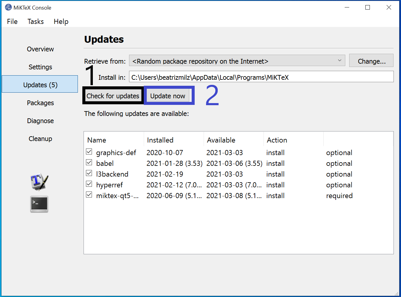 - Abra o MiKTeX console através do menu Iniciar do Windows. No menu lateral, escolha a opção “Updates”. Clique em “Check for updates”, e o MiKTeX buscará informações sobre as possíveis atualizações necessárias. Então clique em “Update now”, para que as atualizações sejam baixadas e instaladas. Essa etapa também pode demorar um pouco!