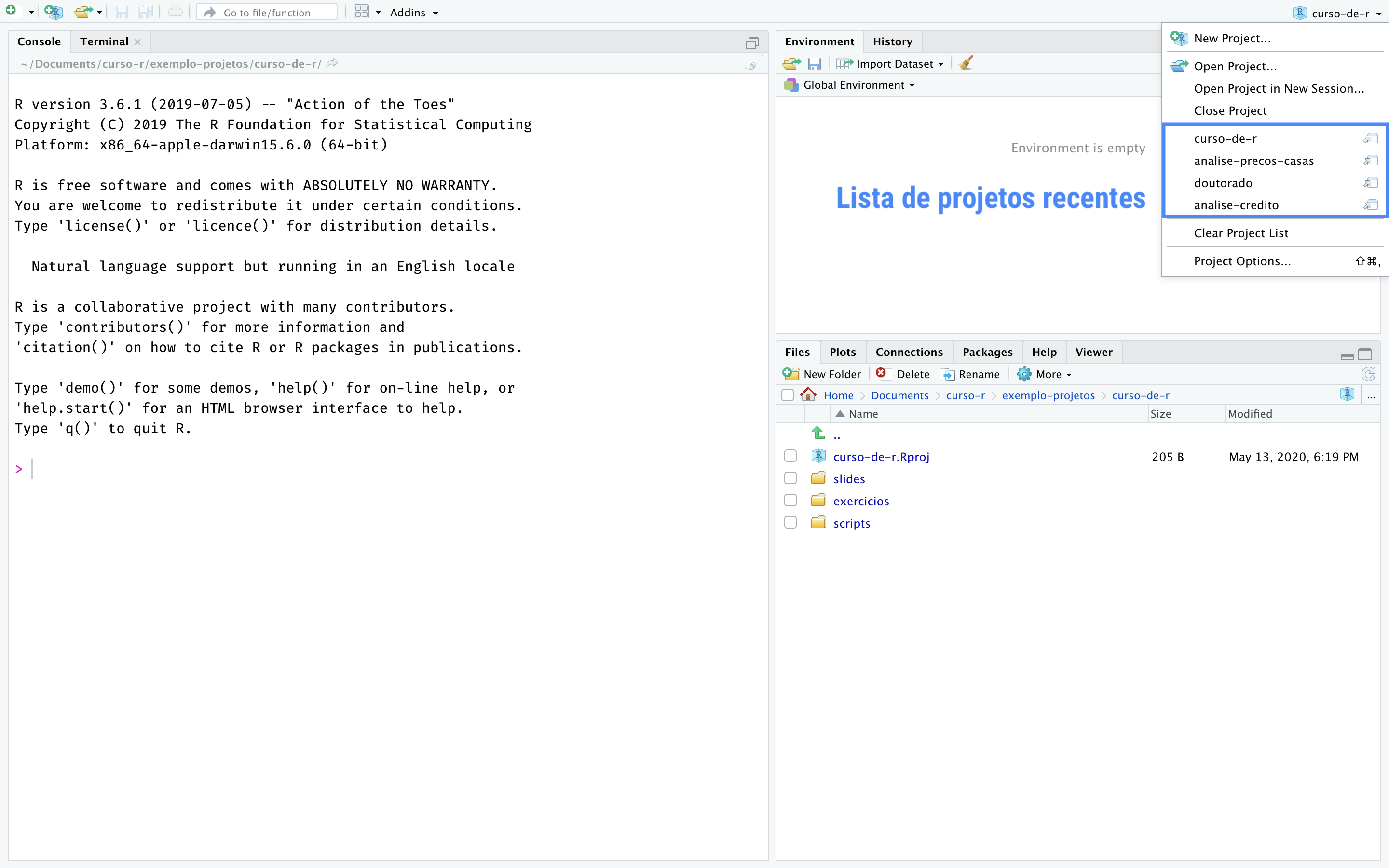 Você que está começando agora no R, já se habitue a criar um novo projeto para cada nova análise que for fazer.