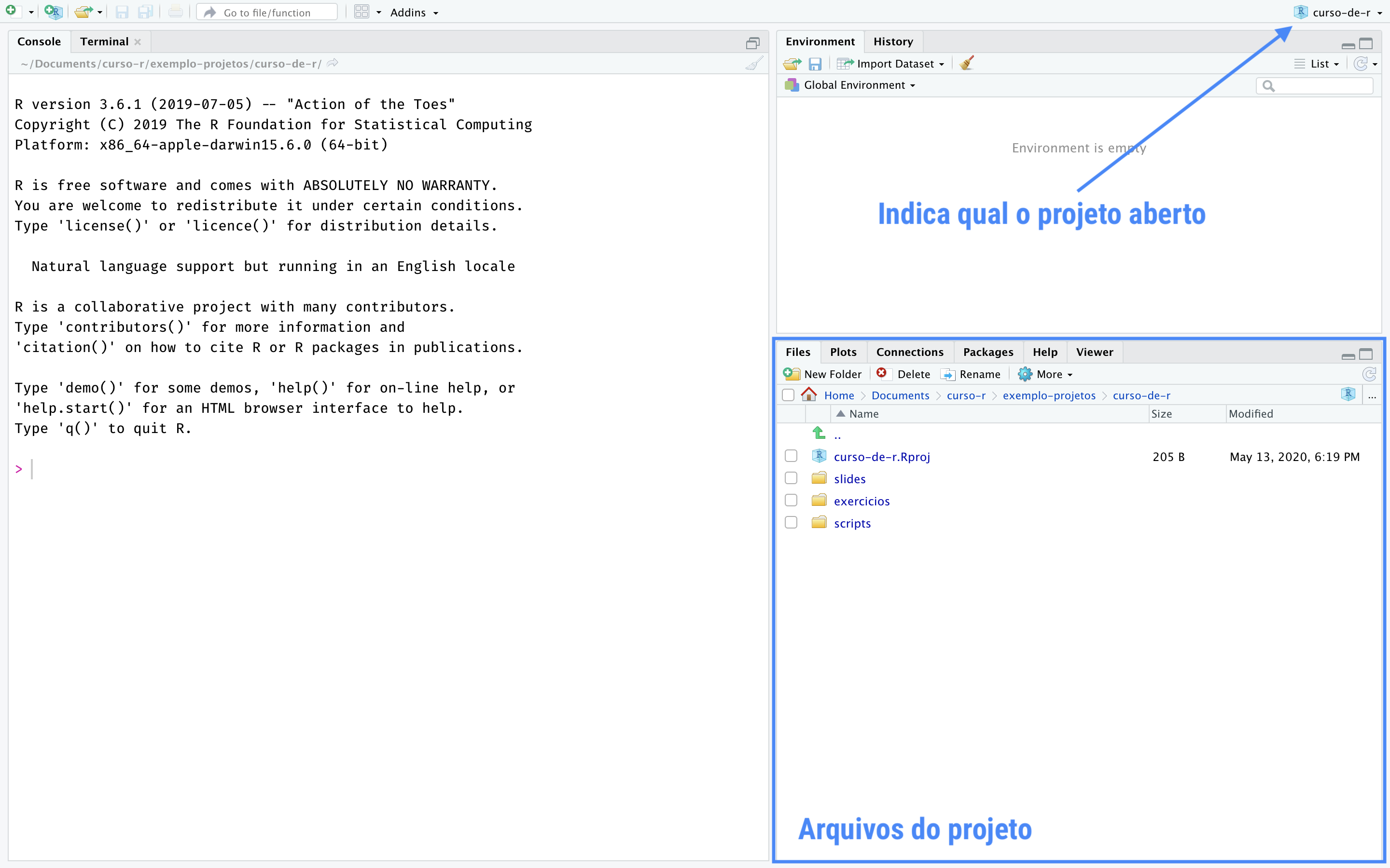 Quando um projeto estiver aberto no RStudio, o seu nome aparecerá no canto superior direito da tela. Na aba Files, aparecerão todos os arquivos contidos no projeto.