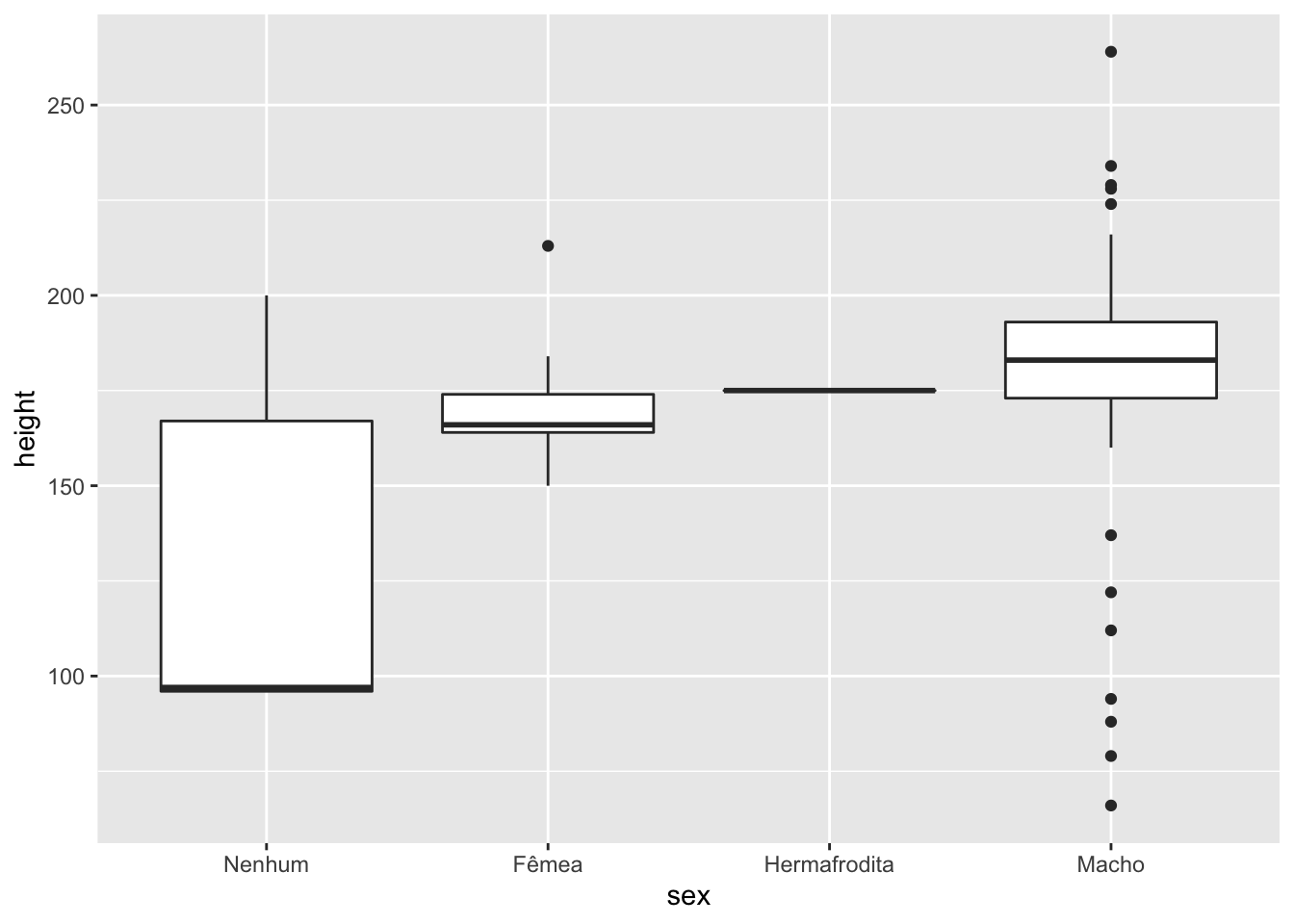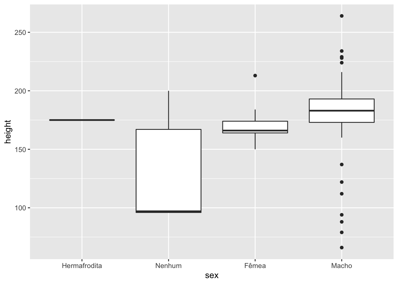 No exemplo abaixo, utilizamos .fun = median, o que significa que, para cada nível da variável sex, vamos calcular a mediana da variável height e ordenaremos os níveis de sex conforme a ordem dessas medianas. Assim, o primeiro nível será o sexo com menor altura mediana, o segundo nível será o sexo com a segunda menor algura media e assim por diante. Se quiséssemos ordenar de forma decrescente, bastaria utilizar o argumento .desc = TRUE.