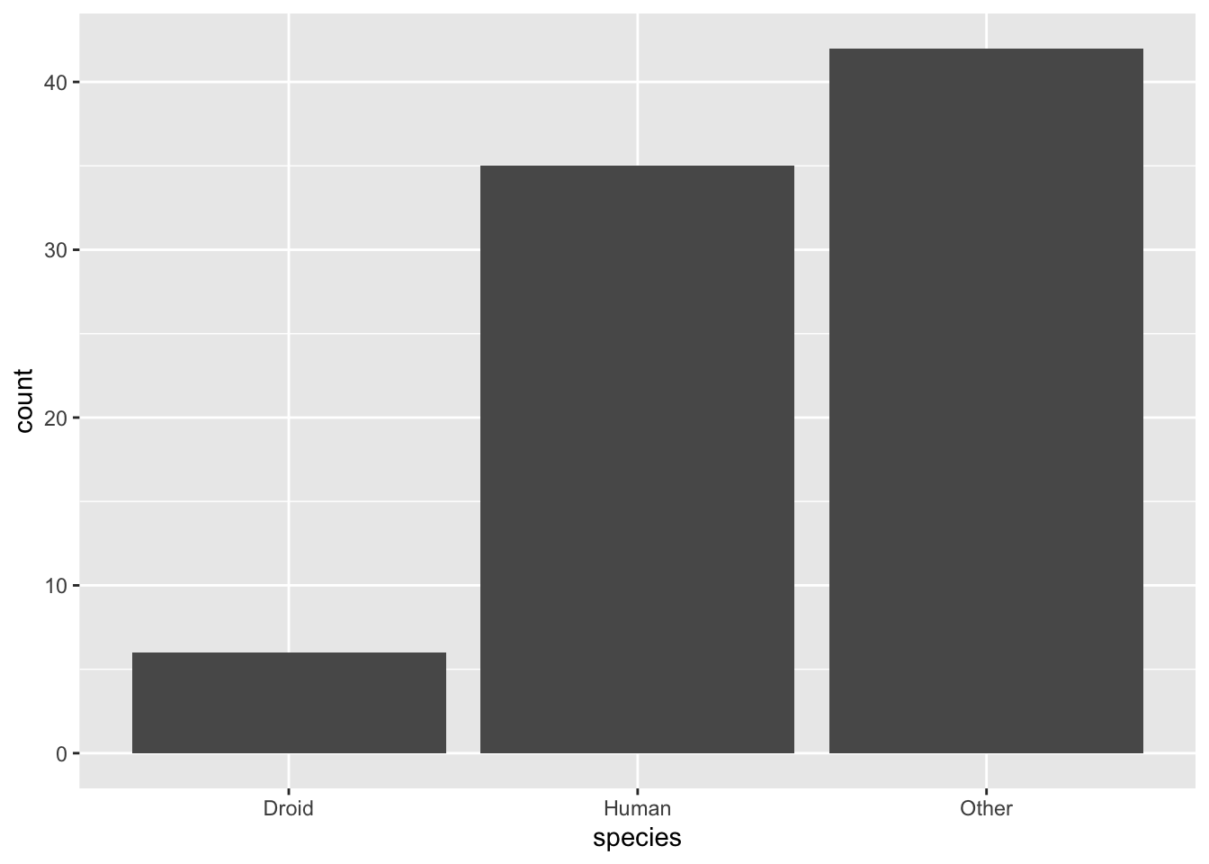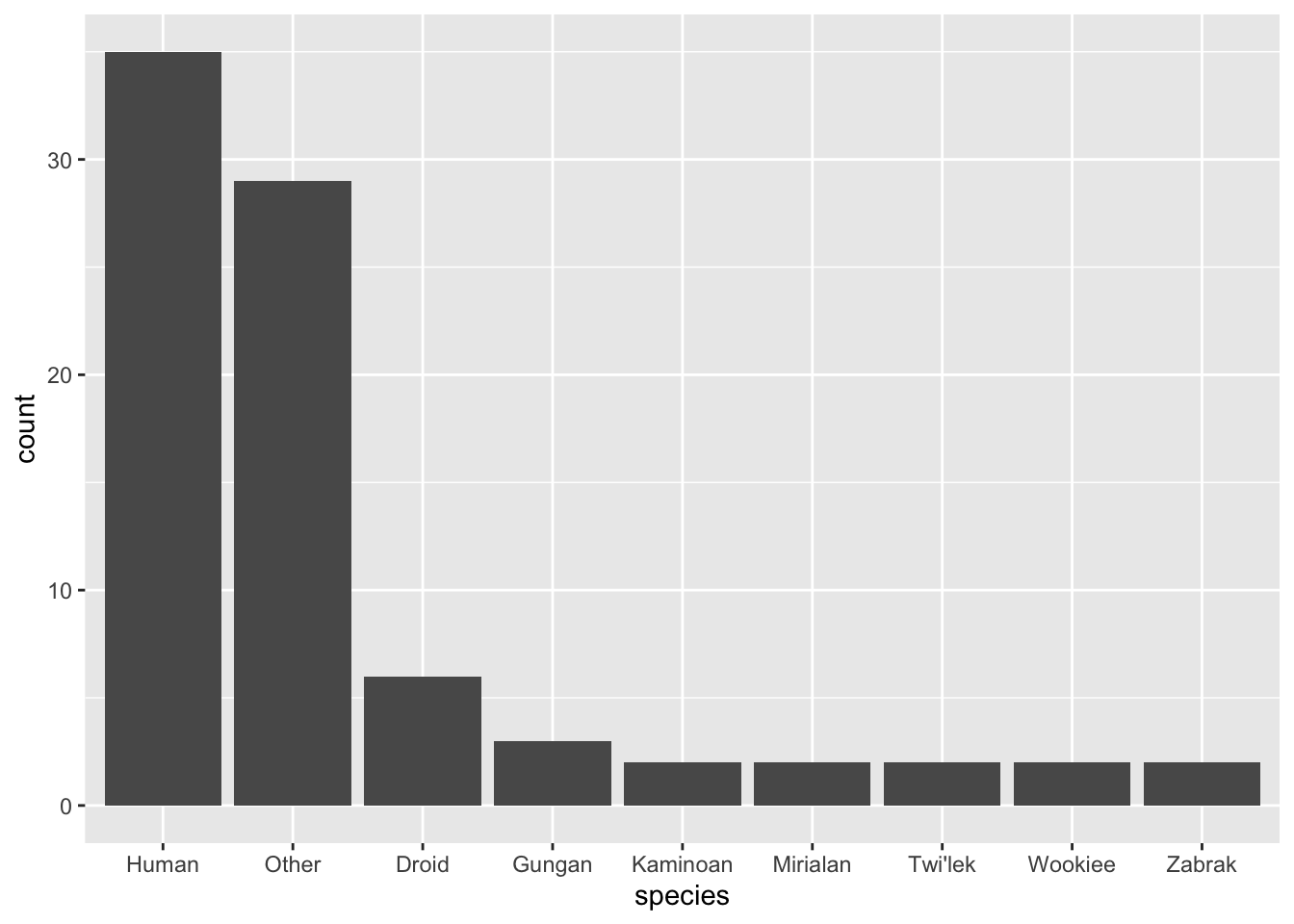 ## Levels: Droid Gungan Human Outras espéciesTambém podemos transformar em Outras os níveis cuja frequência relativa é menor que um determinado limite, por exemplo, 2%. No exemplo abaixo, apenas espécies que representam mais de 2% dos personagem na base são mantidas. As demais foram transformadas em Outras.
