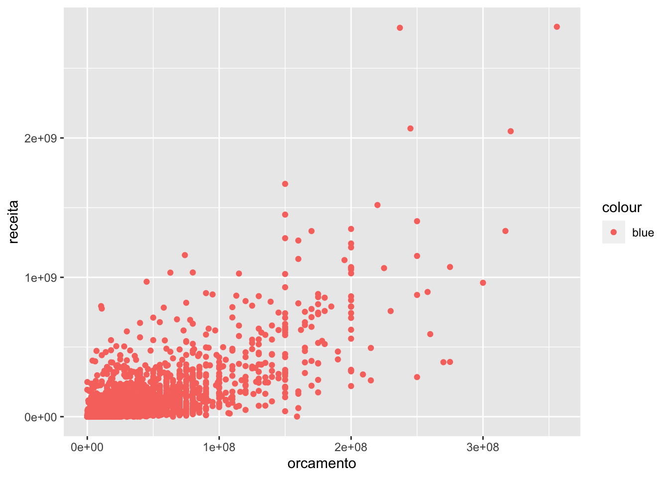 geom_point(aes(x = orcamento, y = receita, color = "blue"))## Warning: Removed 7004 rows containing missing values (geom_point).