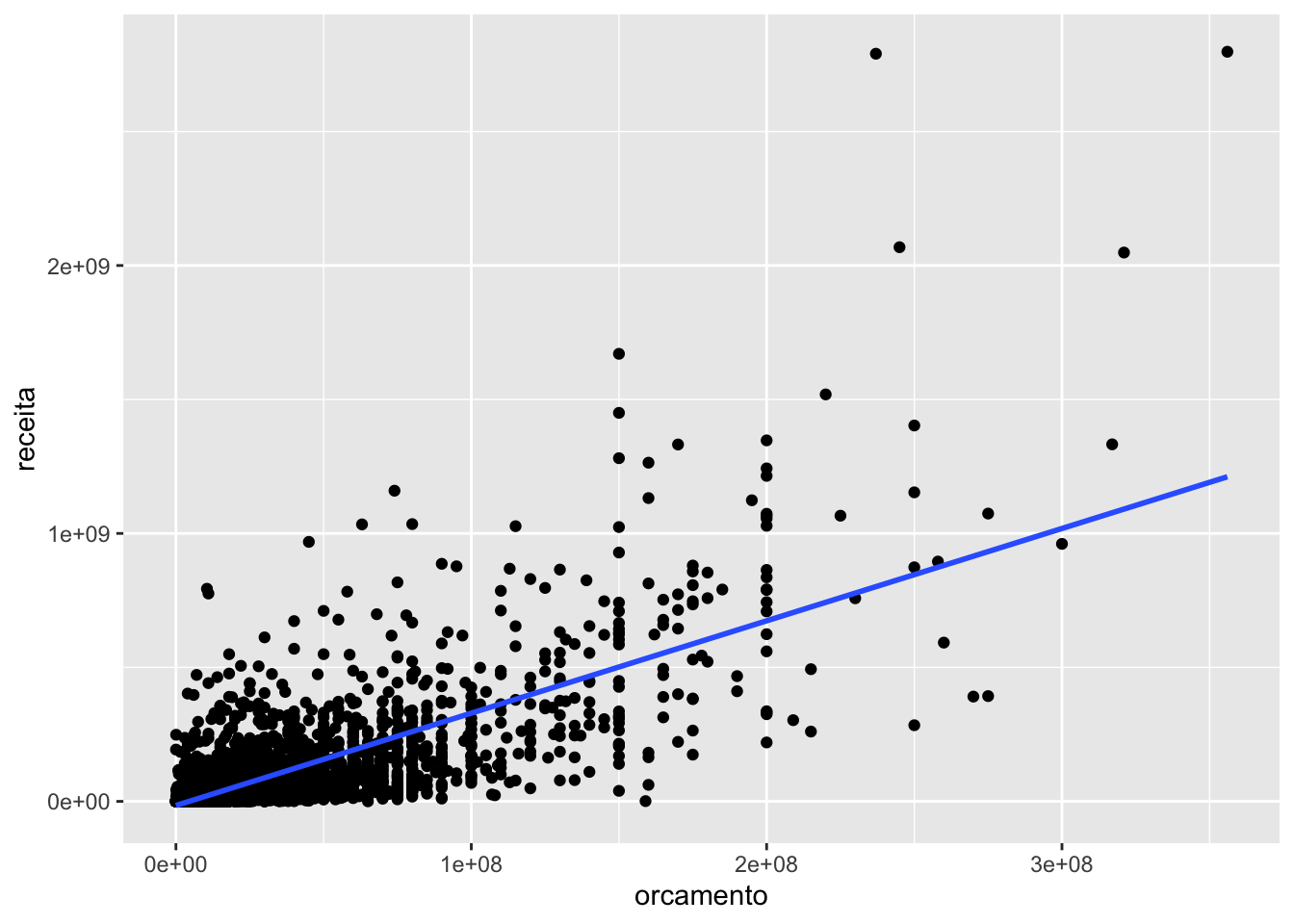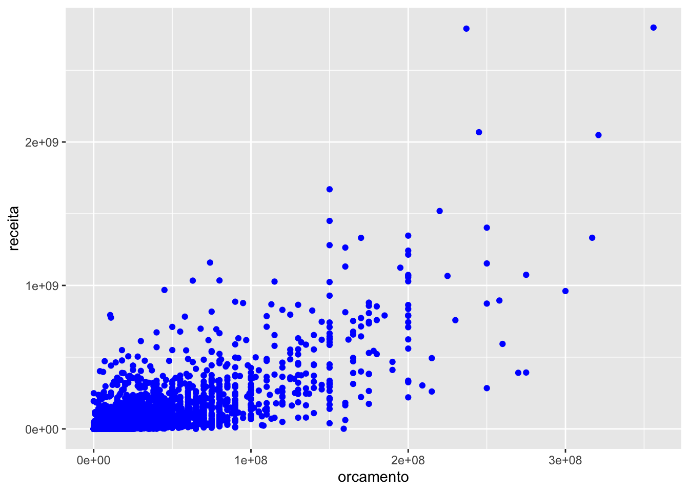 geom_point(aes(x = orcamento, y = receita), color = "blue")## Warning: Removed 7004 rows containing missing values (geom_point).