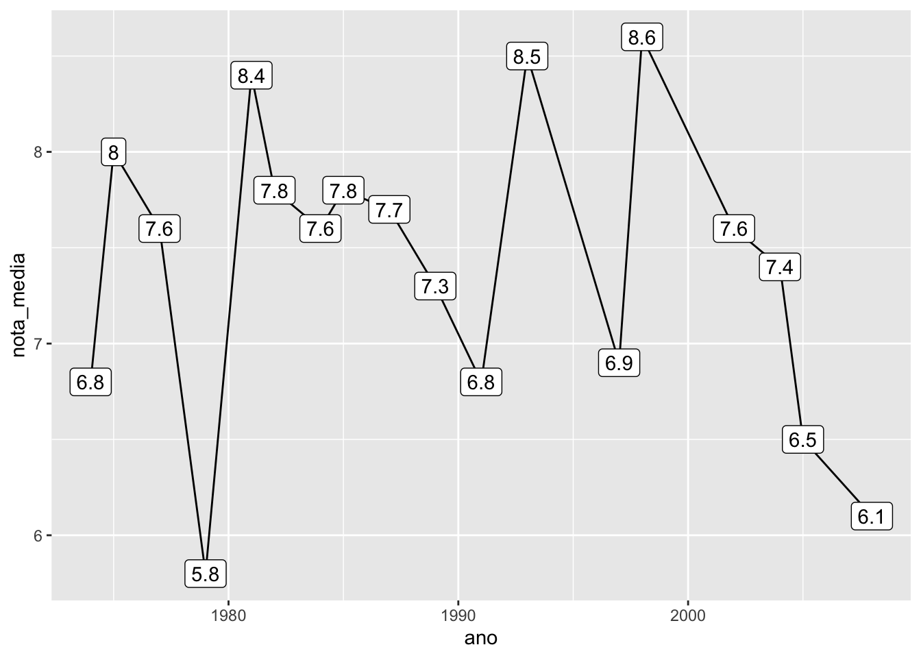 Se algum geom necessitar de um atributo que os outros não precisam, esse atributo pode ser especificado normalmente dentro dele. Abaixo, utilizamos o geom_label para colocar as notas médias no gráfico. Além do x e y, o geom_label também precisa do texto que será escrito no gráfico.
