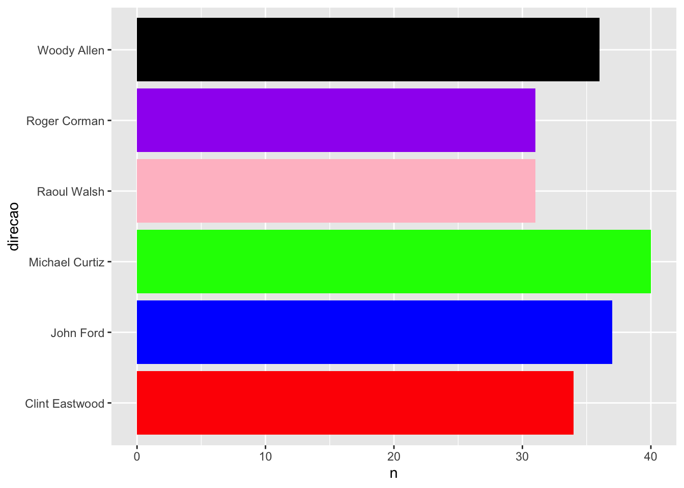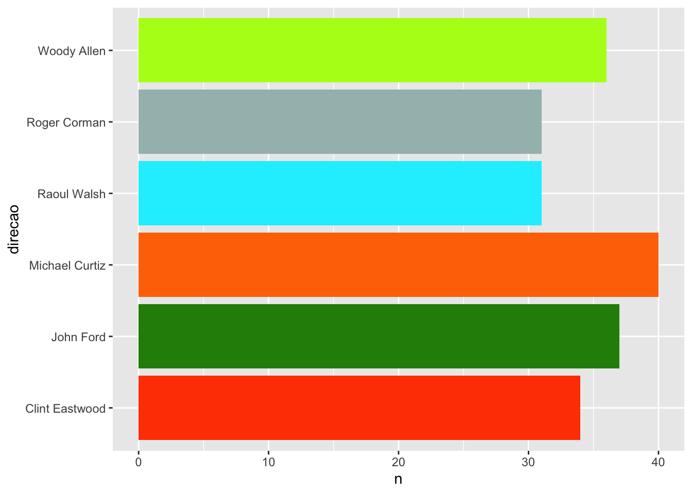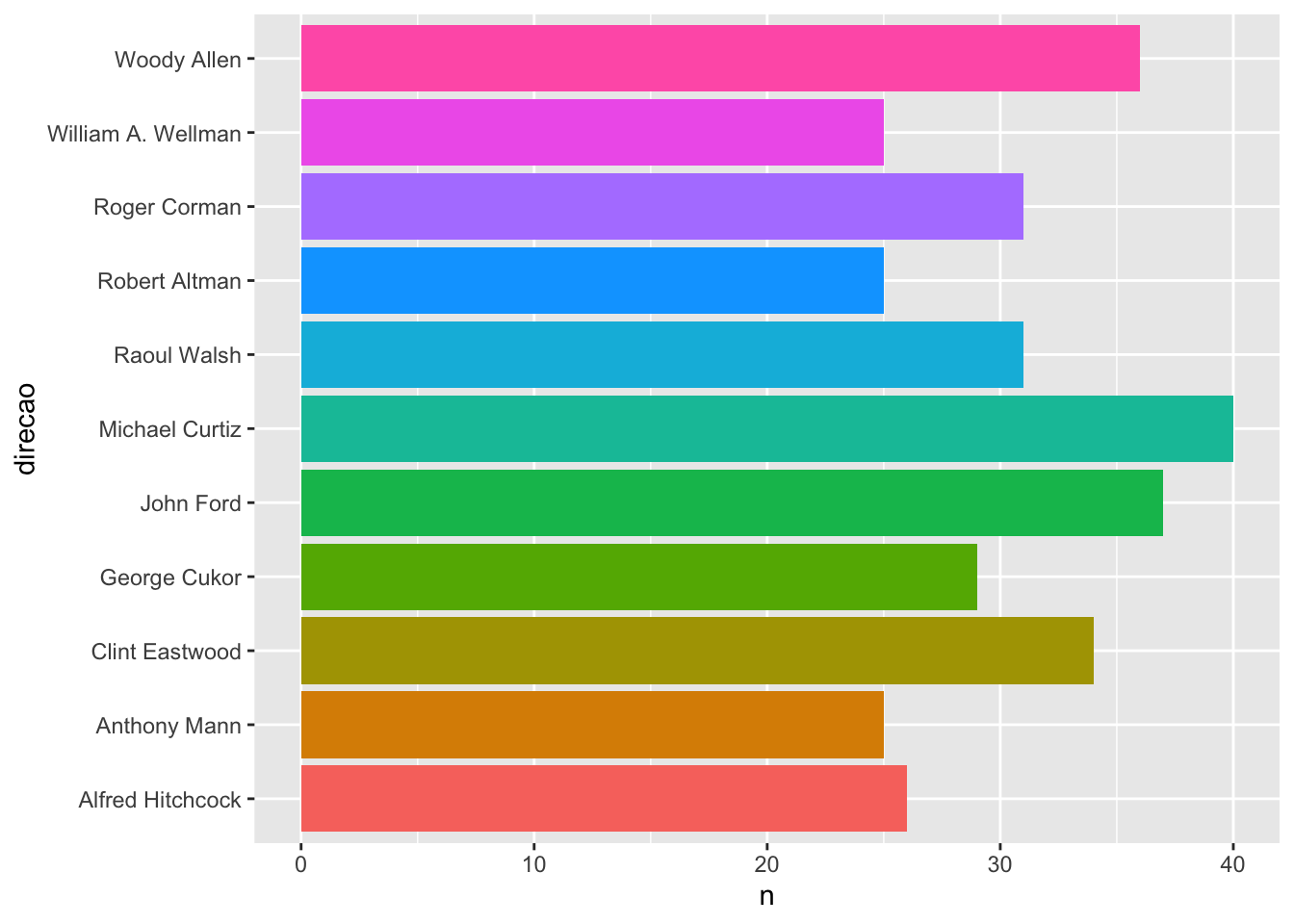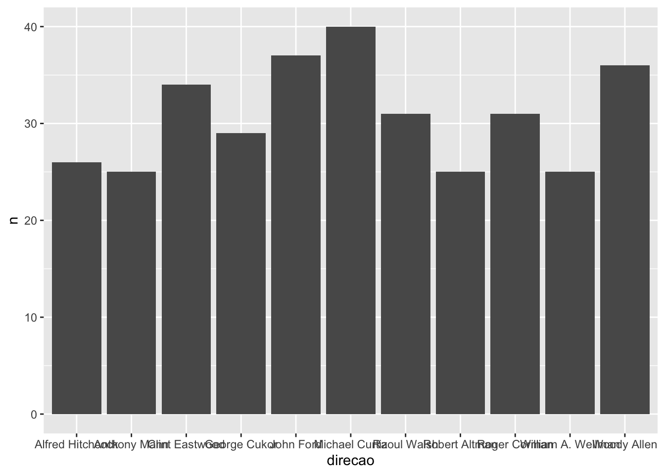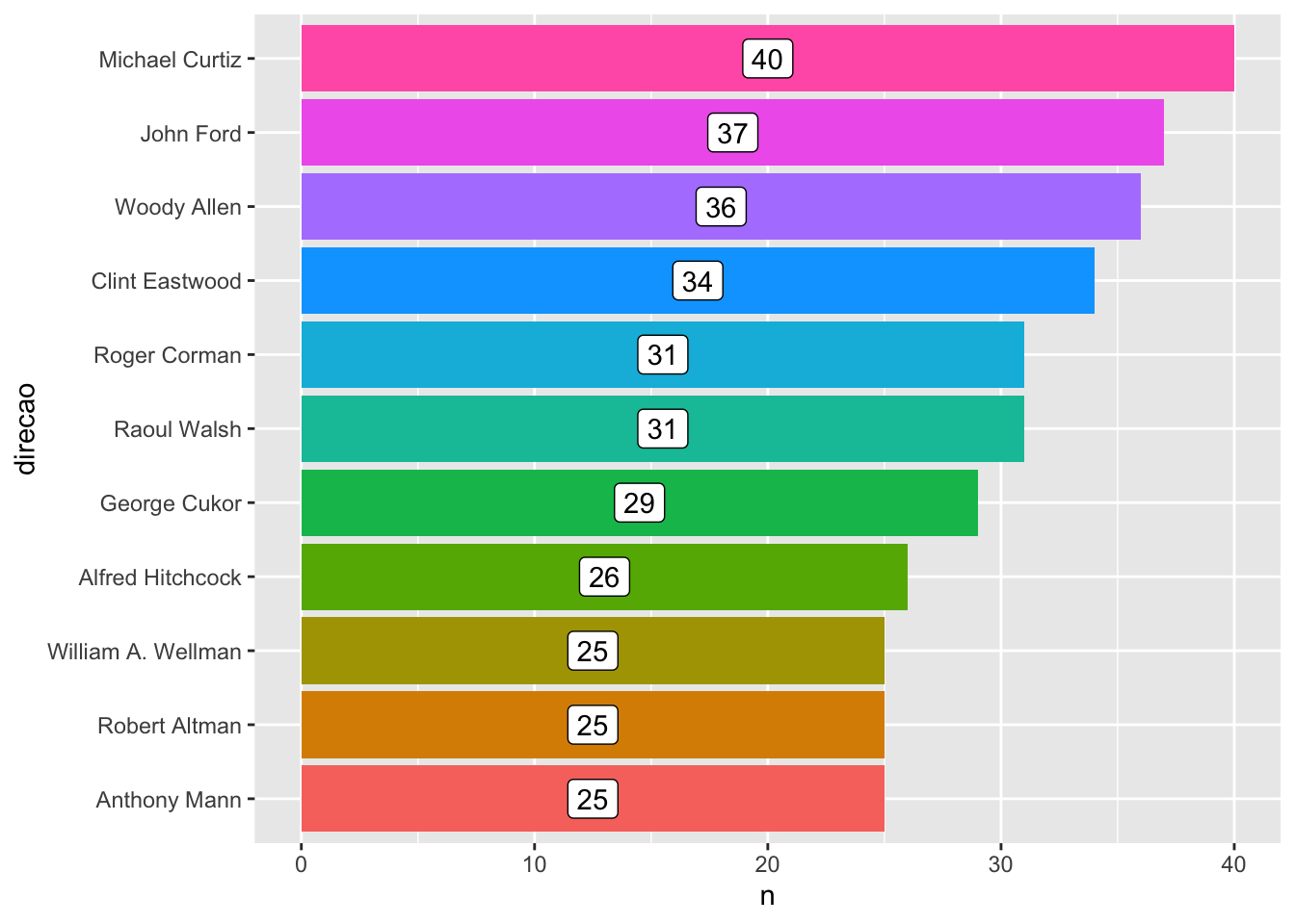 Para construir gráficos de barras, utilizamos o geom_col. A seguir, construímos um gráfico de barras do número de filmes das 10 pessoas que dirigiram mais filmes na nossa base do IMDB.