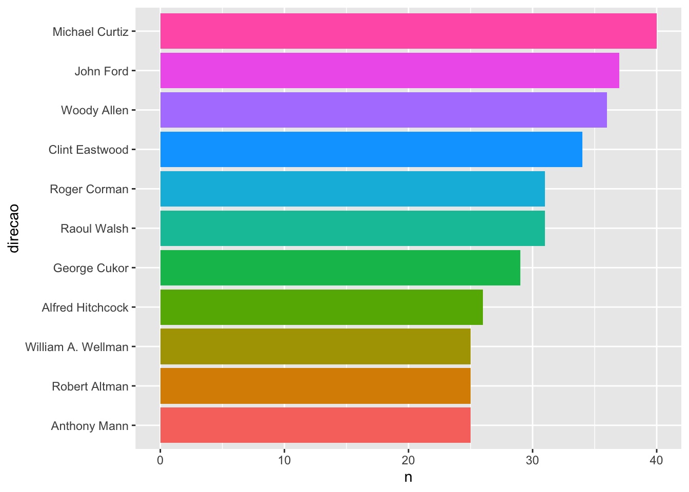 Para ordenar as colunas, precisamos mudar a ordem dos níveis do fator direcao. Para isso, utilizamos a função fct_reorder() do pacote forcats. A nova ordem será estabelecida pela coluna n (quantidade de filmes).