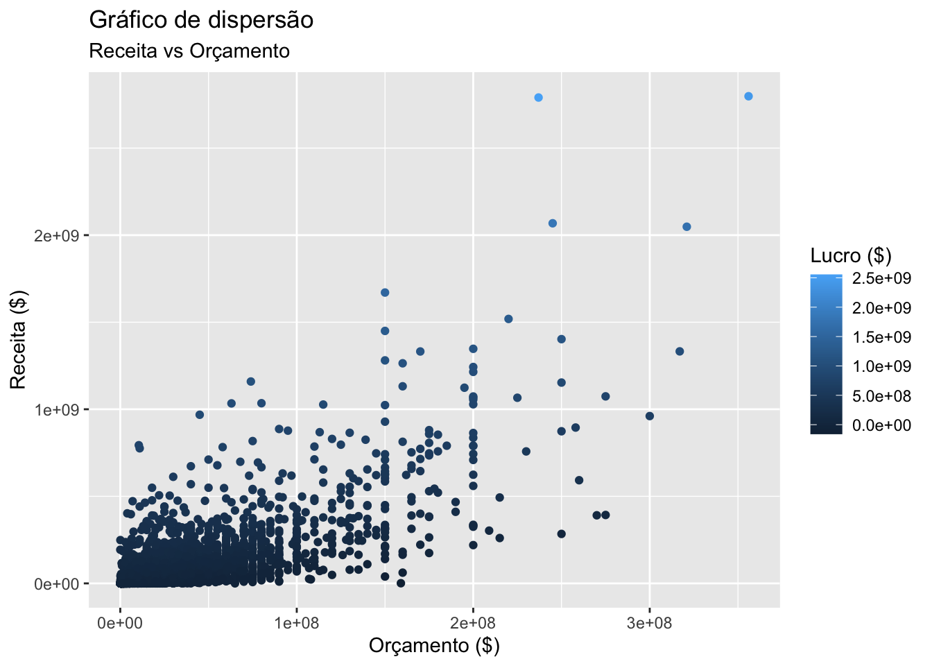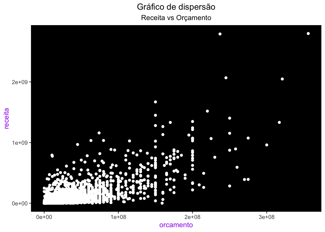 labs(title = "Gráfico de dispersão", subtitle = "Receita vs Orçamento") +