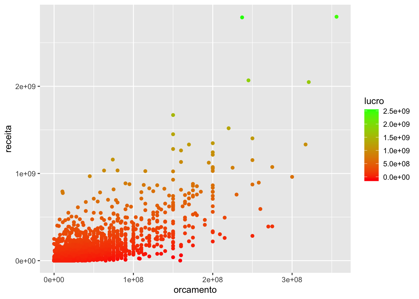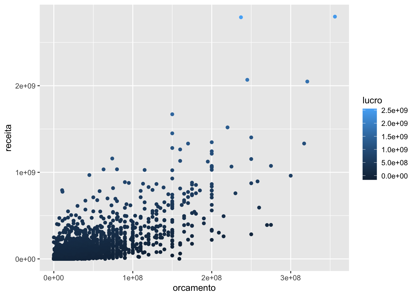 geom_point(aes(x = orcamento, y = receita, color = lucro))## Warning: Removed 7004 rows containing missing values (geom_point).