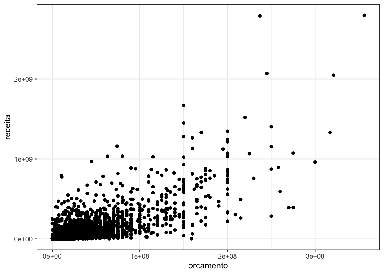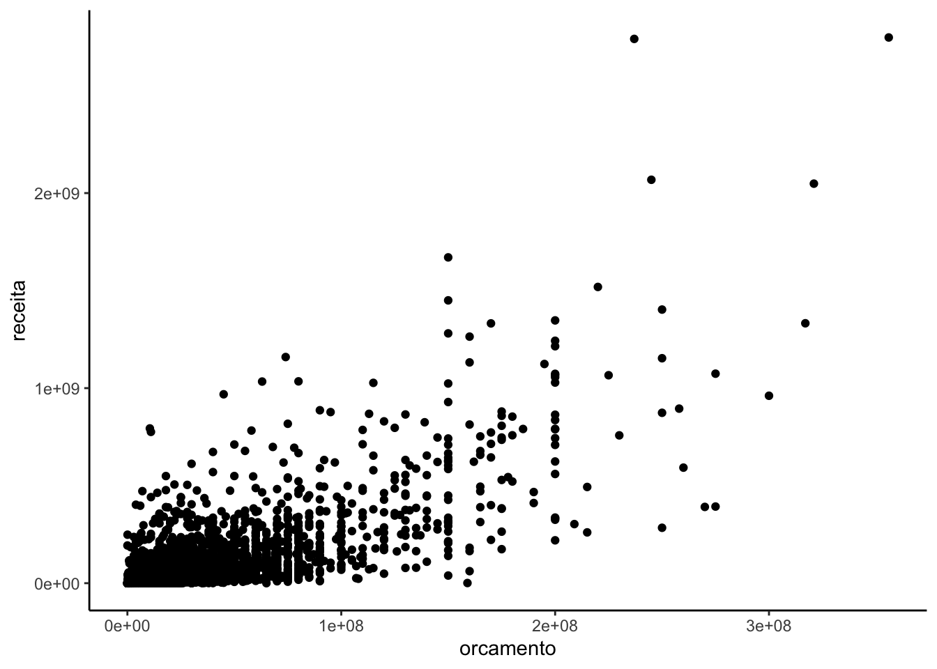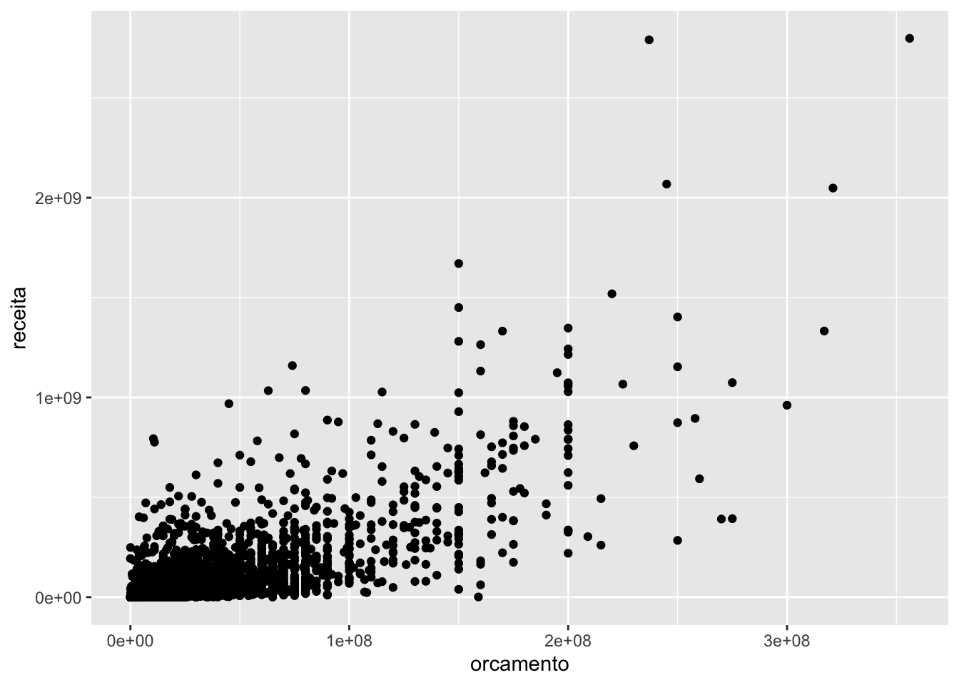 geom_point(mapping = aes(x = orcamento, y = receita))## Warning: Removed 7004 rows containing missing values (geom_point).