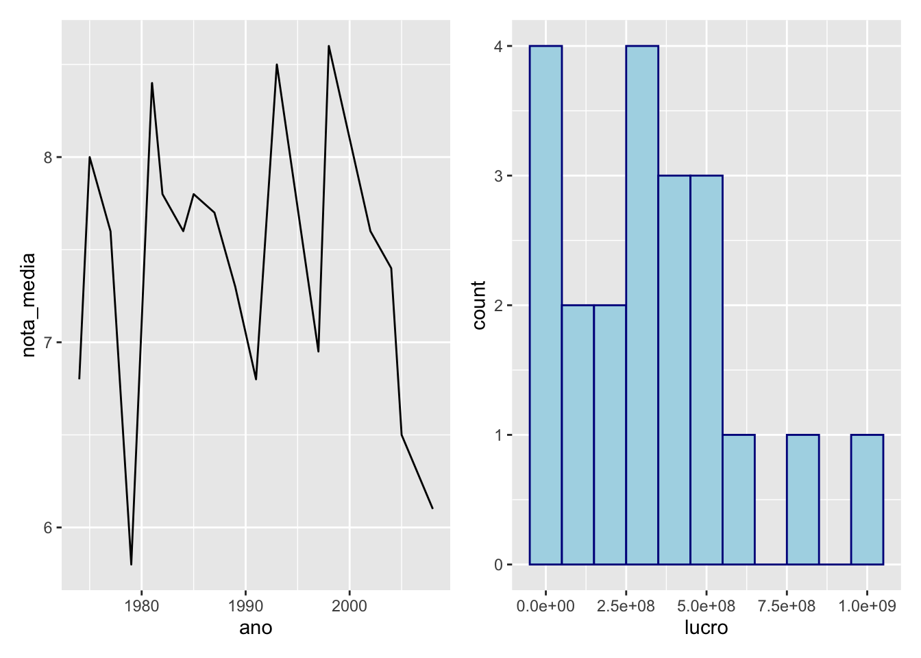 Diversos outros pacotes trazem ferramentas super úteis para trabalharmos com o ggplot2. Um deles é o pacote {patchwork}. Após carregá-lo, podemos juntar dois gráficos em uma mesma figura com um simples +.