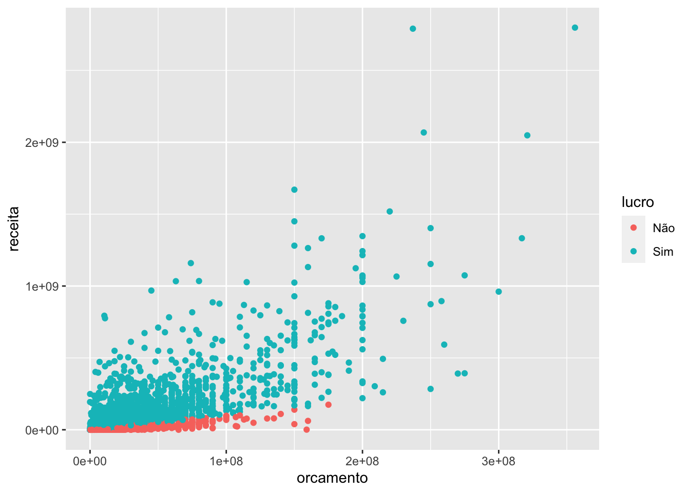 Poderíamos também classificar os filmes entre aqueles que lucraram ou não. Neste caso, como a coluna lucrou é textual, uma cor é atribuída a cada categoria.