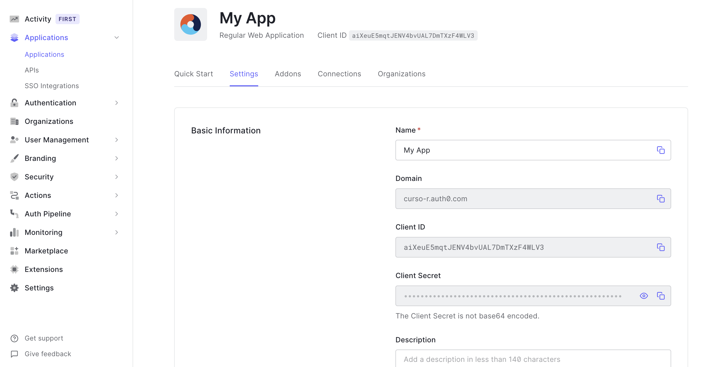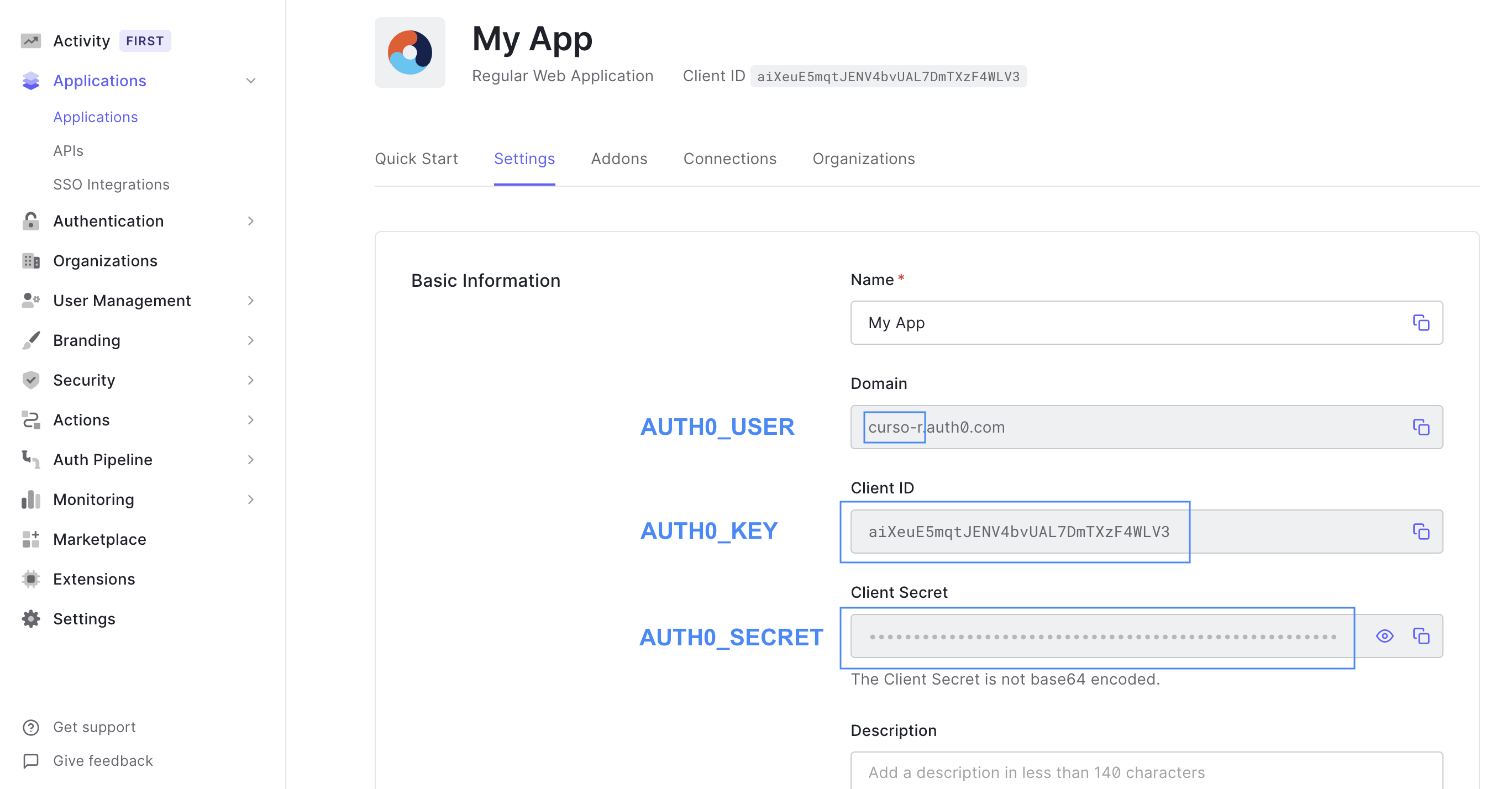...pelos valores encontrados na opçãoSettingsda sua aplicação no Auth0, conforme a imagem abaixo: