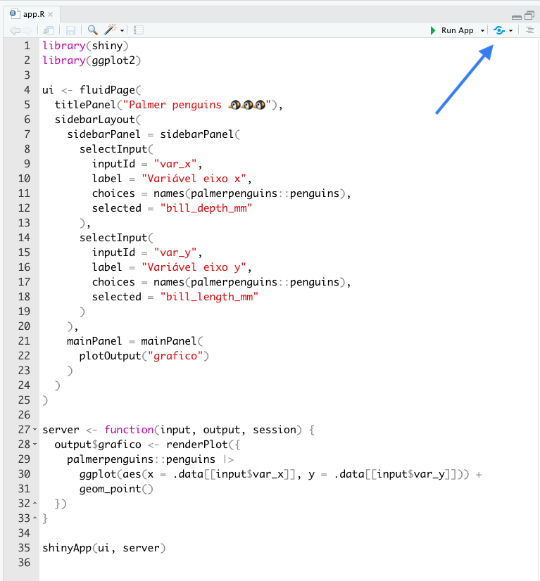app.R. Caso contrário, você não terá acesso aos botões “Run App” ou “Publish”.