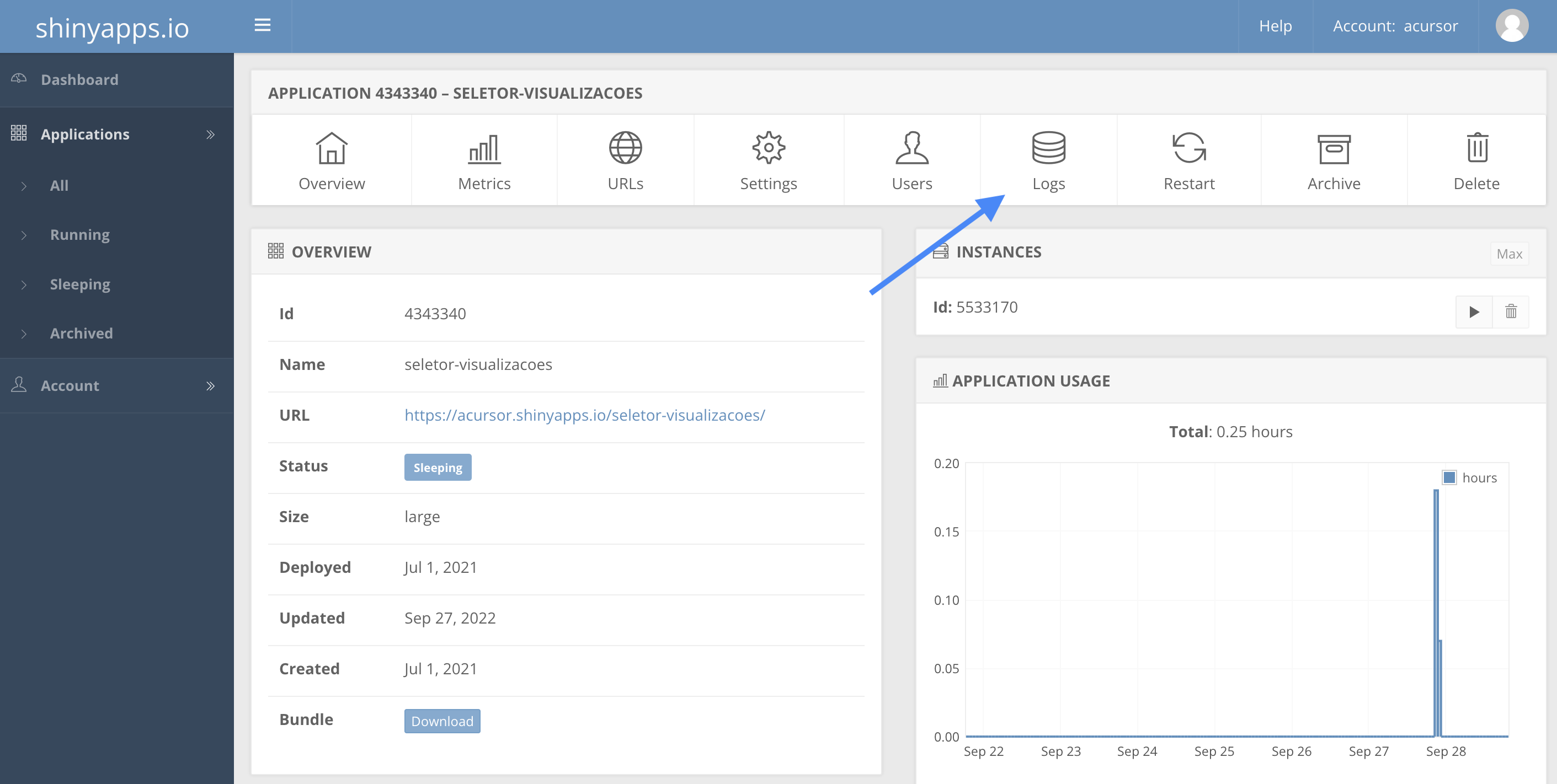 Caso o seu app não abra devido a algum erro, você pode acessar os logs de utilização para ter uma dica do que aconteceu. Para isso, no dashboard do ShinyApps.io, acesse Applications > All, no meu lateral. Em seguida, clique no app que você gostaria de investigar. Por fim, acesse a opção “Logs”.