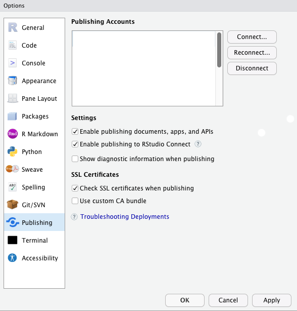 secret = 'secret_do_token>')Abra o seu RStudio e acesse Tools > Global Options… > Publishing.