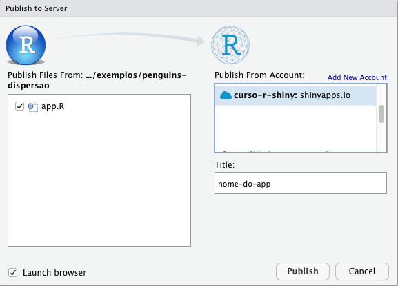 Com a conta conectada, para subir um app para o servidor do shinyapps.io basta abrir o script do seu app e clicar no botão “Publish”.