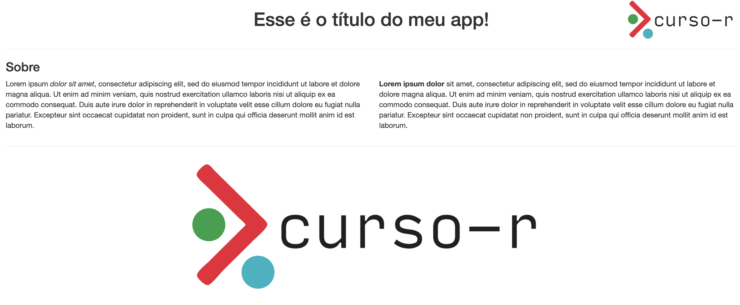Repare que agora a imagem no fim da página foi centralizada utilizando as funções fluidRow() e column(). Não foi mais necessário definir CSS diretamente para realizar essa tarefa. Como exercício, rode esse app e veja o que acontece com a página conforme você diminui o comprimento da tela.