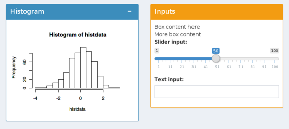 Se olharmos o código HTML gerado por um box(), notamos que essas estruturas são colunas dentro do Bootstrap. Por essa razão, a função box() deve sempre estar dentro de uma fluidRow(), como fizemos no código acima.