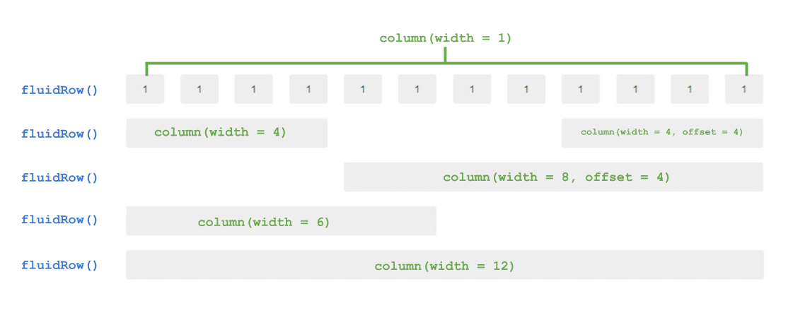 No Shiny, para criar novas linhas, utilizamos a função fluidRow(). Para criar colunas dentro de uma linha, utilizamos a função column(). Essa função tem dois argumentos: width e offset. O primeiro determina o comprimento da coluna (de 1 a 12). O segundo indica quanto espaço horizontal gostaríamos de “pular” antes de começar a nossa coluna. A função column() é sempre utilizada dentro da função fluidRow().