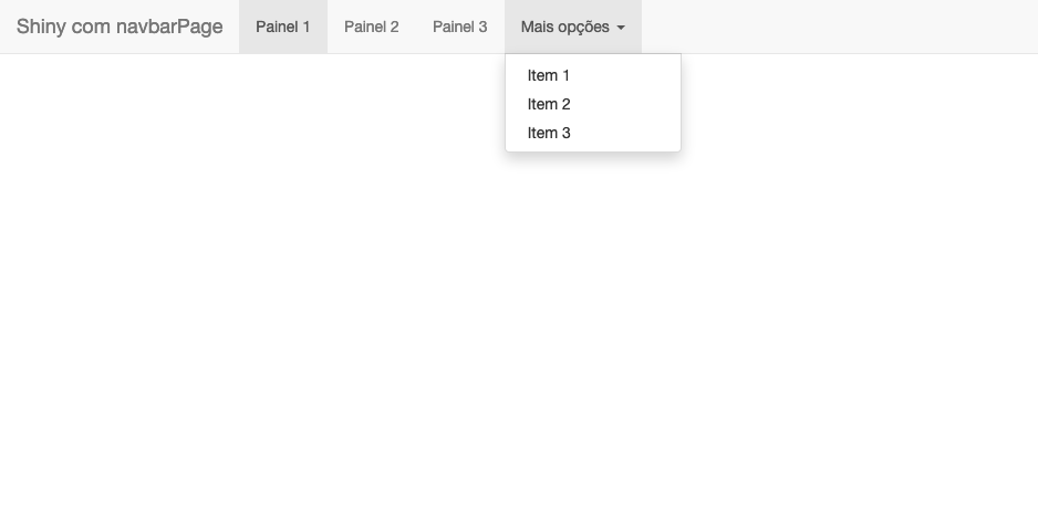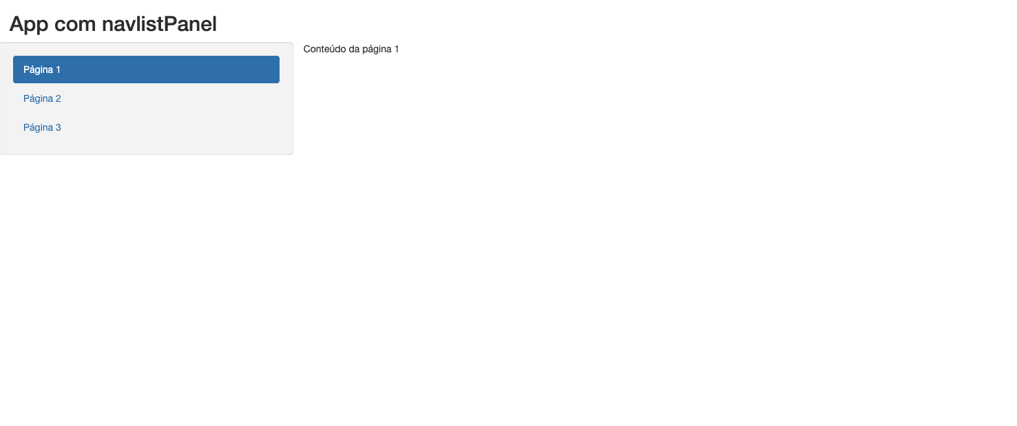 sidebarLayout(): para criar um aplicativo com uma barra lateral;navbarPage(): para criar um aplicativo com um menu de navegação no topo da tela;navlistPanel(): para criar um menu de navegação lateral;